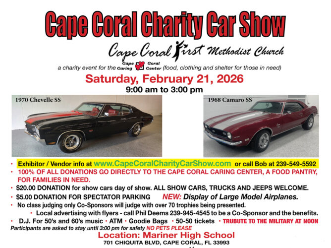 The ninth annual Cape Coral Charity Car Show, sponsored by Cape Coral First Methodist Church, takes place from 9 a.m. to 3 p.m. on Feb. 21.