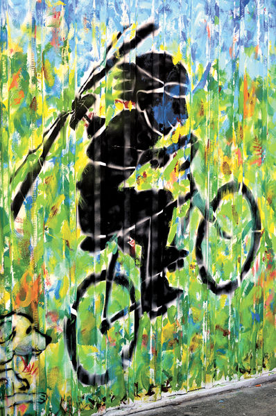 Creating the over-large stencils presented another challenge. “What could I find big enough to use for life-size stencils? Kitty came up with the idea of using banners that had been left over from Habitat events. It worked. It’s perfect.”