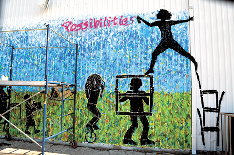 The students were to paint the background for Collins’ life-size, stenciled figures of ReStore shoppers parading from the store with their purchases, but painting on a “canvas” of deeply corrugated metal can be tricky. “I told them to apply the paint in short strokes,” Collins explained. The effect of the mix of blue and yellow and green slap-strokes is not unlike the impressionistic technique of Vincent Van Gogh. “The kids brought a lot of energy to the project,” Collinst grinned.