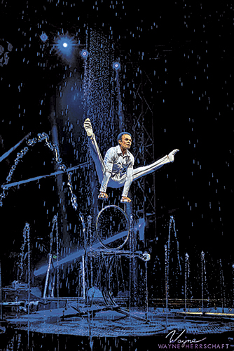 “Inspired by the element of water, the acts express versatility and fluidity through human movement while curtains of rain and fountain jets crisscross in time to each move,” reads the description on Cirque Italia’s website. “Laser lights and bubbles also add to the interdimensional effect. In a nod to the inner child, mermaids rise from the depths, and even dinosaurs make an appearance.”