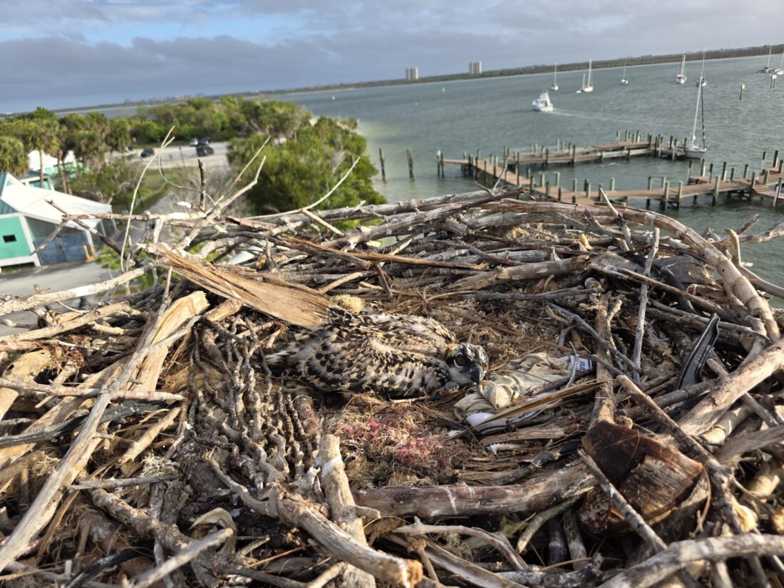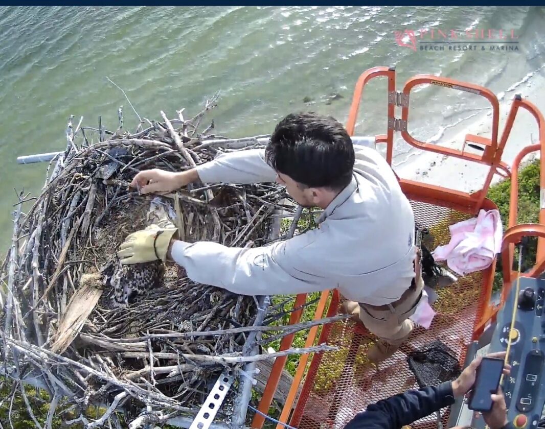 The Pink Shell Beach Resort partnered with CROW to cross-foster a baby osprey at their nest that had been rescued after falling in Captiva. Howell helped take part in bringing that baby osprey into the nest after removing the dead one.