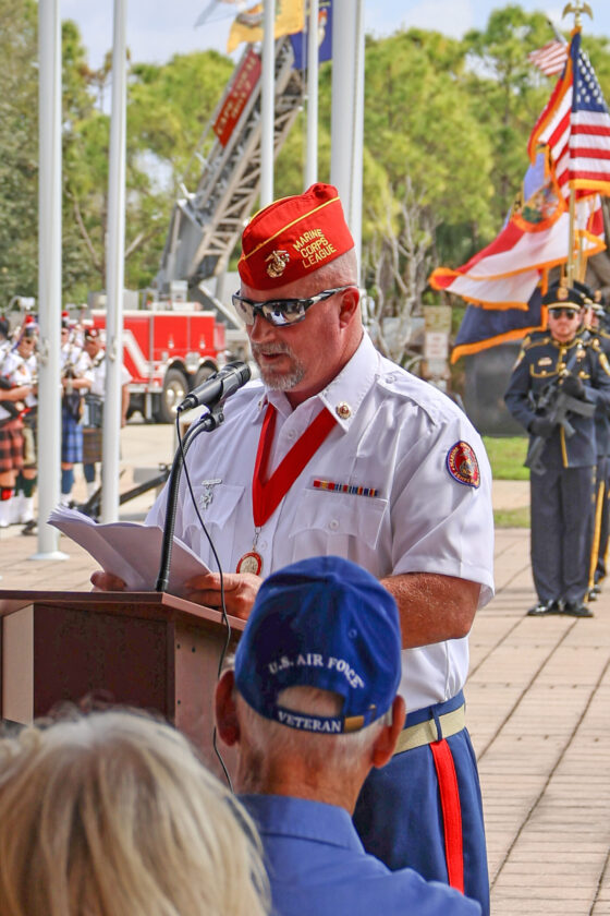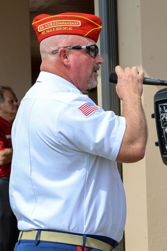 Marine Corps League Sr. Vice Commandant Matthew Giambrone, USMC LCPL E3 and Iraqi Freedom War veteran, gives the opening introduction to the ceremony. MARK CLIFFORD