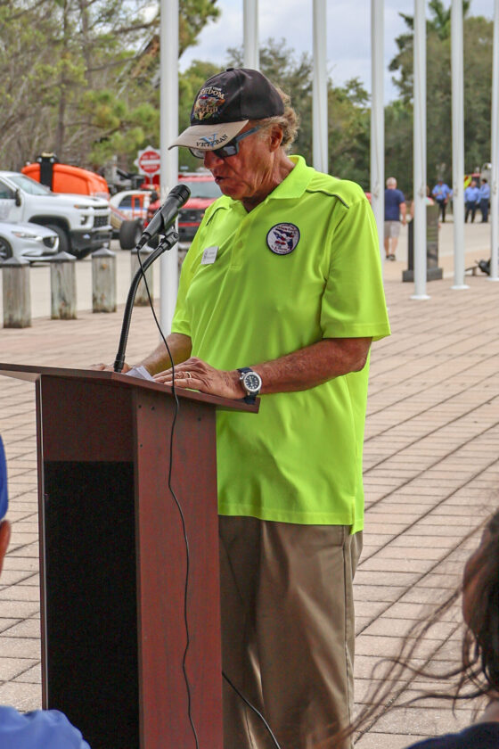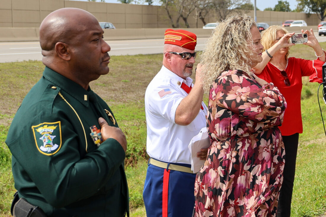 Lee County Sheriff’s Department Lieutenant Angelo Vaughn and USMC veteran CPL E4, Master of Ceremonies Alexis Giambrone, and Marine Corps League Sr. Vice Commandant Matthew Giambrone, USMC LCPL E3 and Iraqi Freedom War veteran. MARK CLIFFORD