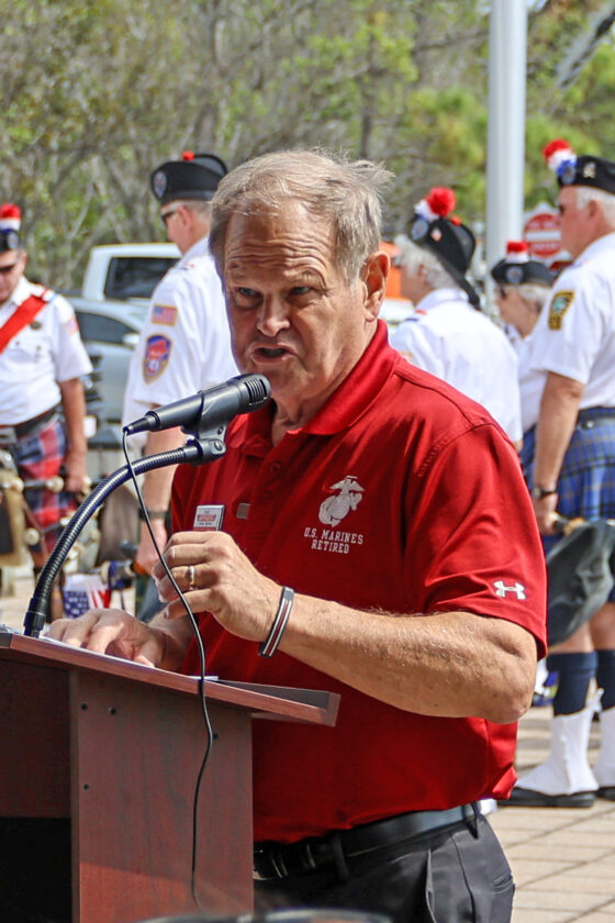 Keynote speaker Mike Pedersen (retired USMC MAJ O4, Naval Academy graduate, Class of 1979, F4 Phantom/F18 Hornet RO, Desert Storm veteran) addresses the veterans and their families. MARK CLIFFORD