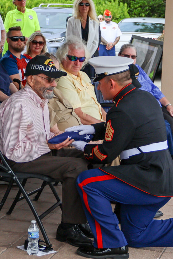 USMC SSGT E6 Wingfield presents the flag to John Camp, US Navy LCDR O4 and WWII veteran. MARK CLIFFORD