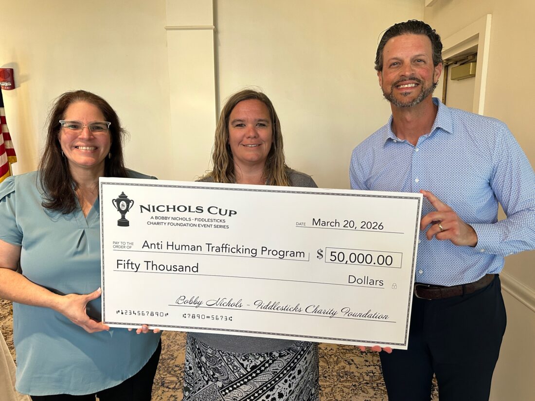 (L to R) Check presented to Anti Human Trafficking Program's Yaritza Soto Ferreira and Bridget Vary with Bobby Nichols-Fiddlesticks Charity Foundation President Bryan Simmering. BOBBY NICHOLS-FIDDLESTICKS CHARITY FOUNDATION
