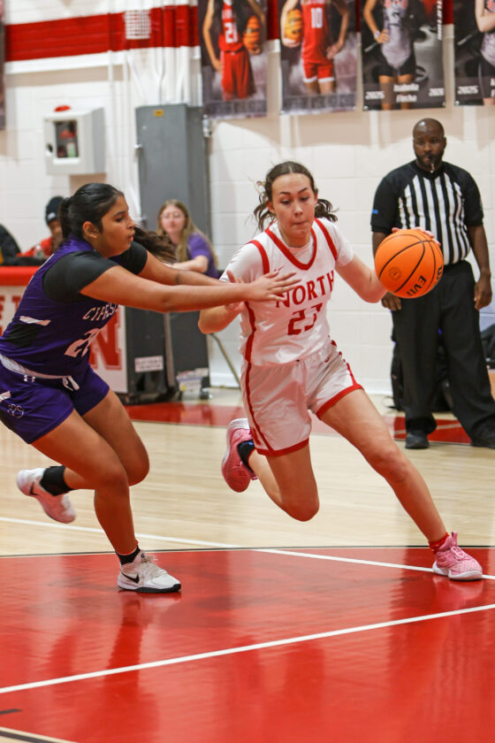 North Fort Myers guard Kelley Conley slips past Panther defender Delilah Winters and drives the baseline. MARK CLIFFORD