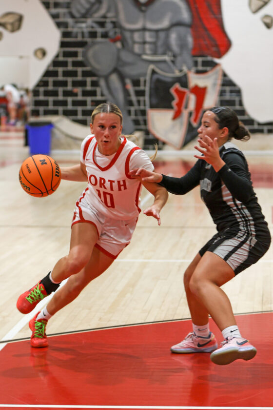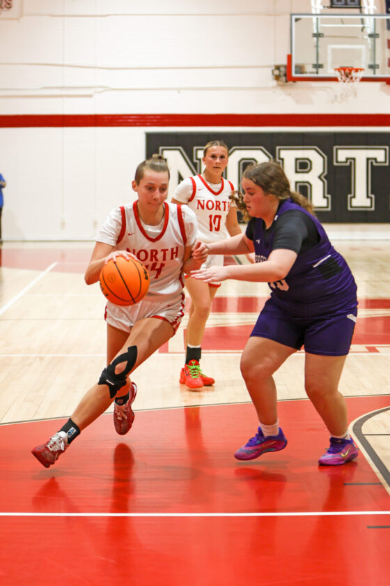 North Fort Myers forward Lily Erickson uses a cross-over dribble to get past Triton defender Maya Wilson. MARK CLIFFORD
