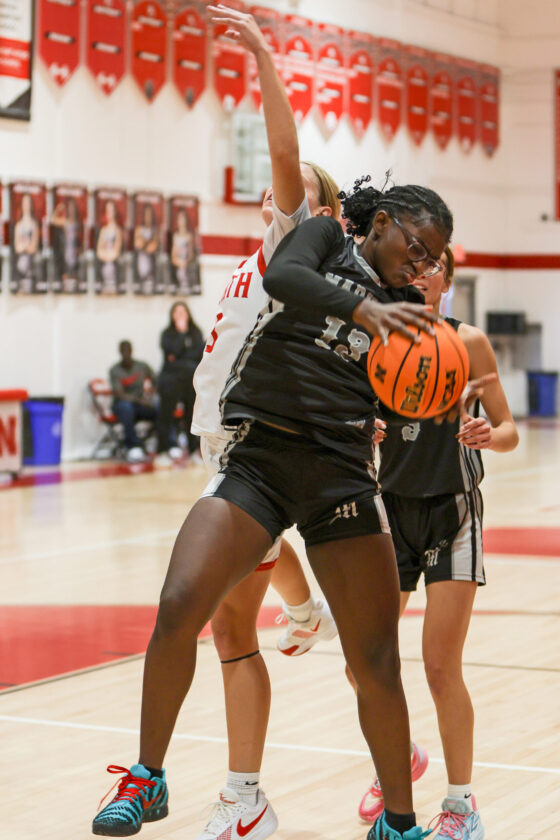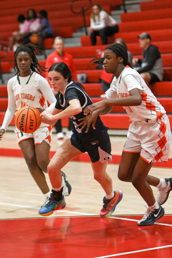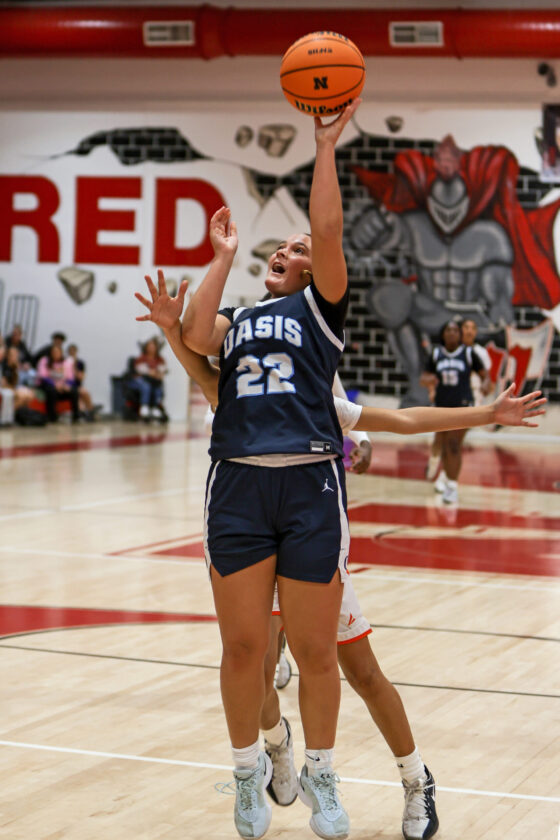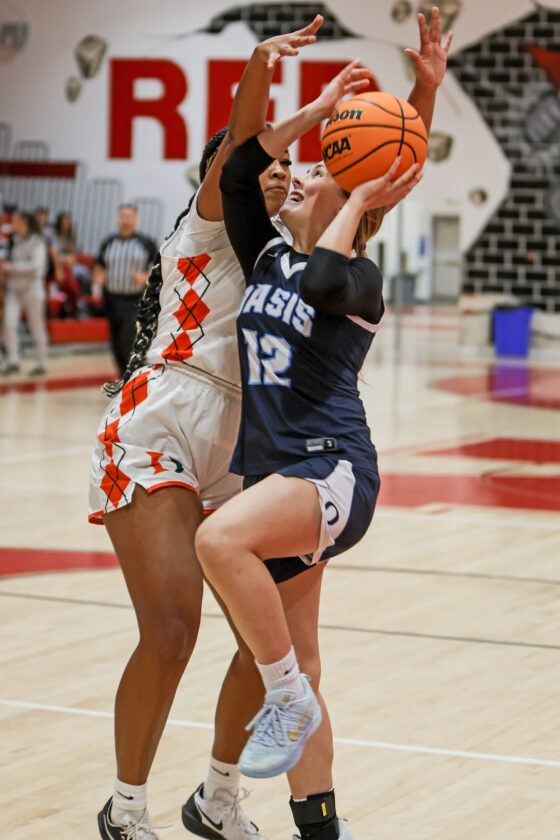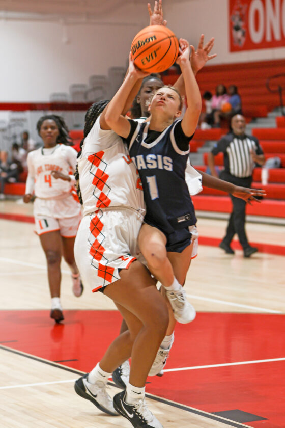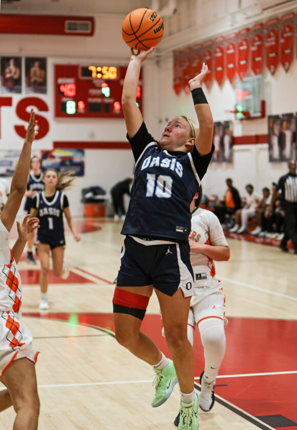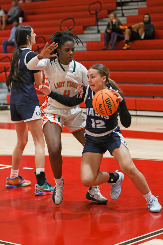 Oasis guard Ellye Henkle finds a hole in the Tiger defense and scores the basket to cut Dumbar’s lead to 40–39 early in the fourth quarter. MARK CLIFFORD