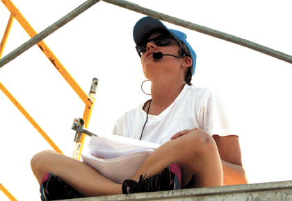 Elizabeth Elliott, a staff member, stood on a scaffold to give the band direction and encourage them to do better through a microphone.