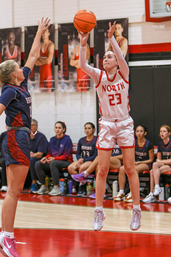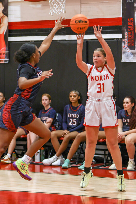 North Fort Myers' Lily Erickson shoots a jumper over Estero’s Jordyn Vaill. MARK CLIFFORD