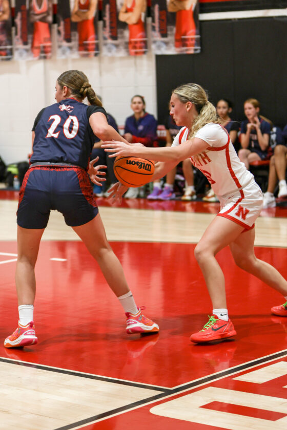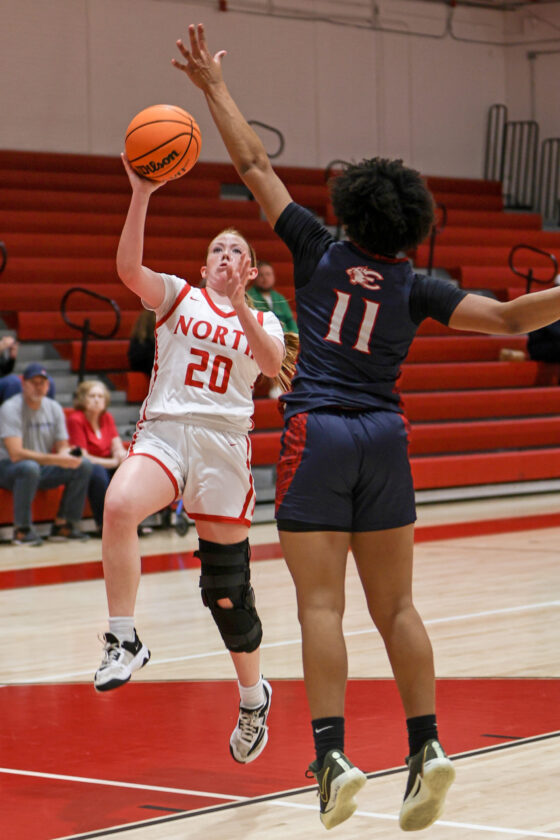 Red Knight guard Bianca Iten glides between Wildcat defenders Amiya Lewis (11) and London Woods (3) and puts up a short, one-handed jump shot. MARK CLIFFORD