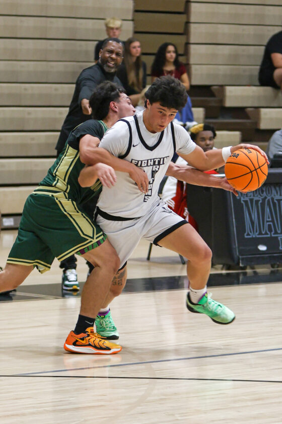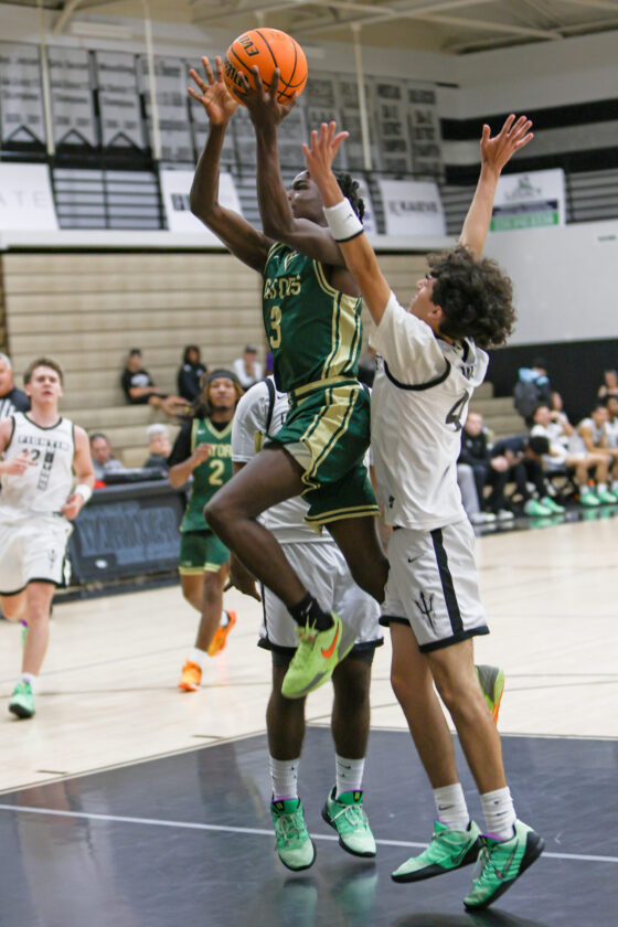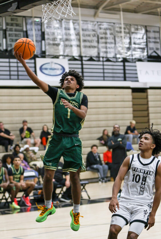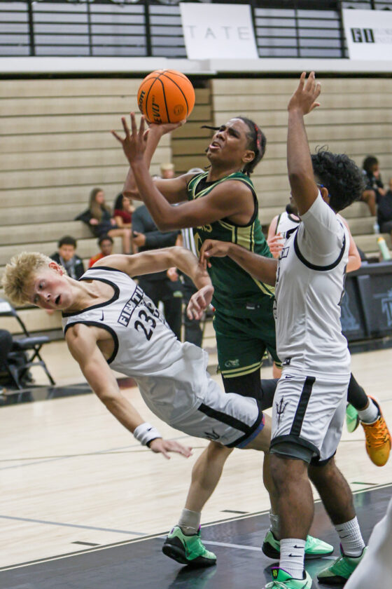 Three points the “Old School Way”: Island Coast’s Atarian Griffin is fouled as he makes the acrobatic shot and then hits his free throw for a 3-point play. MARK CLIFFORD