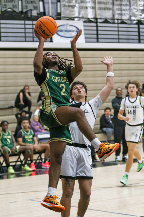 Mariner’s Elmer Reyes looks on as Island Coast’s Jeremias Ortiz finishes the Gator fast break with the layup. MARK CLIFFORD