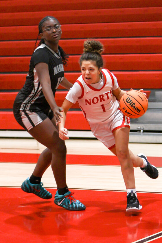 First-round action in the girls’ District 5A-11 tournament between North Fort Myers and Mariner. The Red Knights won the game 57-28. All photos by MARK CLIFFORD