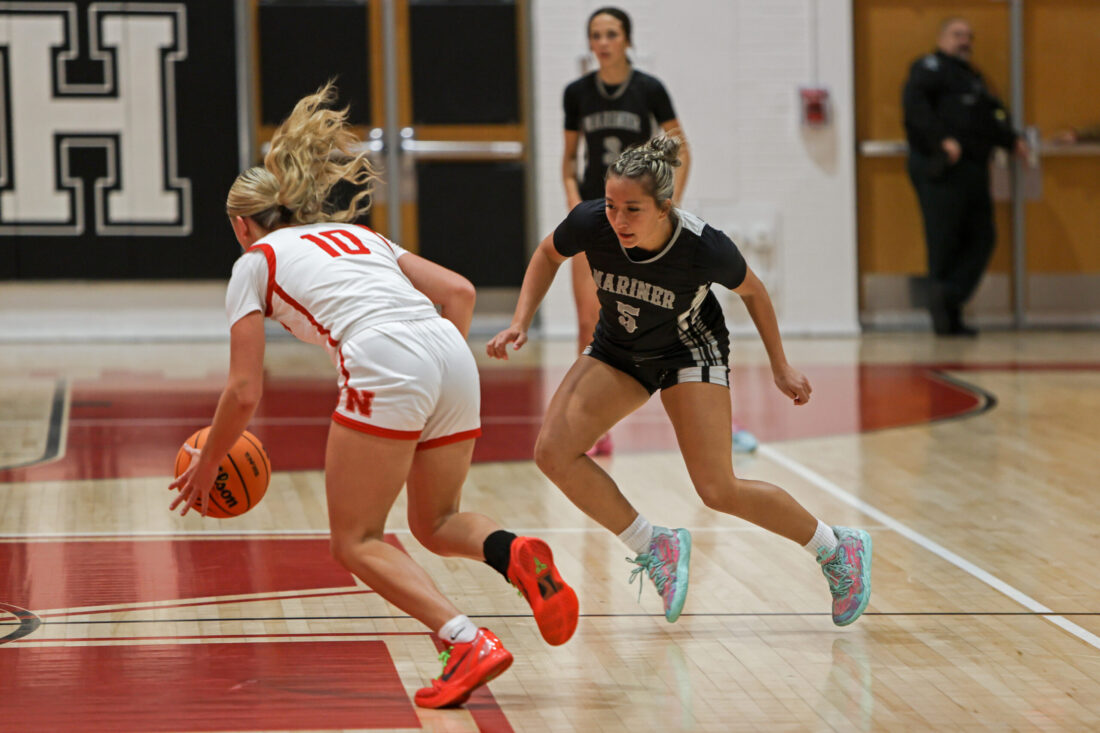 Mariner’s Candice Cooper stops Red Knight freshman guard Tiana Hill from driving down the lane. MARK CLIFFORD